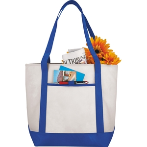 The Lighthouse Non-Woven Boat Tote features an open main compartment and a front pocket with a pen loop. Including double 24 inch handles, it's also reusable and a great alternative to plastic bags.