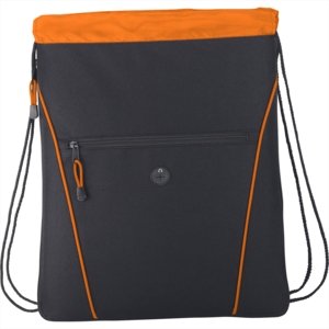 The Raven Drawstring Bag has an open main compartment with a cinching rope closure. It also features a zippered expandable gusset and a zippered front pocket with a convenient earbud port.