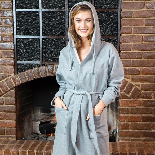 Our most versatile robe is the epitome of comfort. Contemporary design appeals to younger generations. Flexible material makes it ideal for water sports teams, or just for around-the-house leisure. Double-layered sweatshirt fabric, long sleeves with fitted cuffs, two patch pockets, double belt loops and self-belt. Made of 80% cotton / 20% polyester fabric.